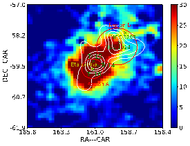 有证据表明年轻的巨星团可能是银河系内高能宇宙线起源之一。永利官网硕士研究生葛婷婷和导师孙晓娜与中国科技大学杨睿智教授等合作,基于Fermi卫星的高能粒子探测器LAT最新的观测数据,研究船底座星云复合体中大质量星团Tr 14和Tr 16周围GeV伽马射线辐射,发现这个区域存在扩散的GeV伽马射线辐射,其空间分布与分子气体一致,用两个高斯盘的空间模型可以很好地解释。两个区域的伽马射线能谱分布均可用轻子和强子两种模型去拟合。区域A的谱较软且显示了一个明显的pion-bump特征,可能是由于A区的双星系统过亮引起,或是双星系统加速的软宇宙线和气体相互作用导致,但也不排除双星系统和大质量星团共同加速宇宙线的情况。B区的高气体密度和伽马射线辐射与分子气体之间较好有空间一致性,其伽玛射线辐射可能起源于强子辐射。两个区域的宇宙线径向分布不符合1/r的关系,可能由于该系统中的宇宙线是来自最近的一些脉冲过程,而不是持续注入的。